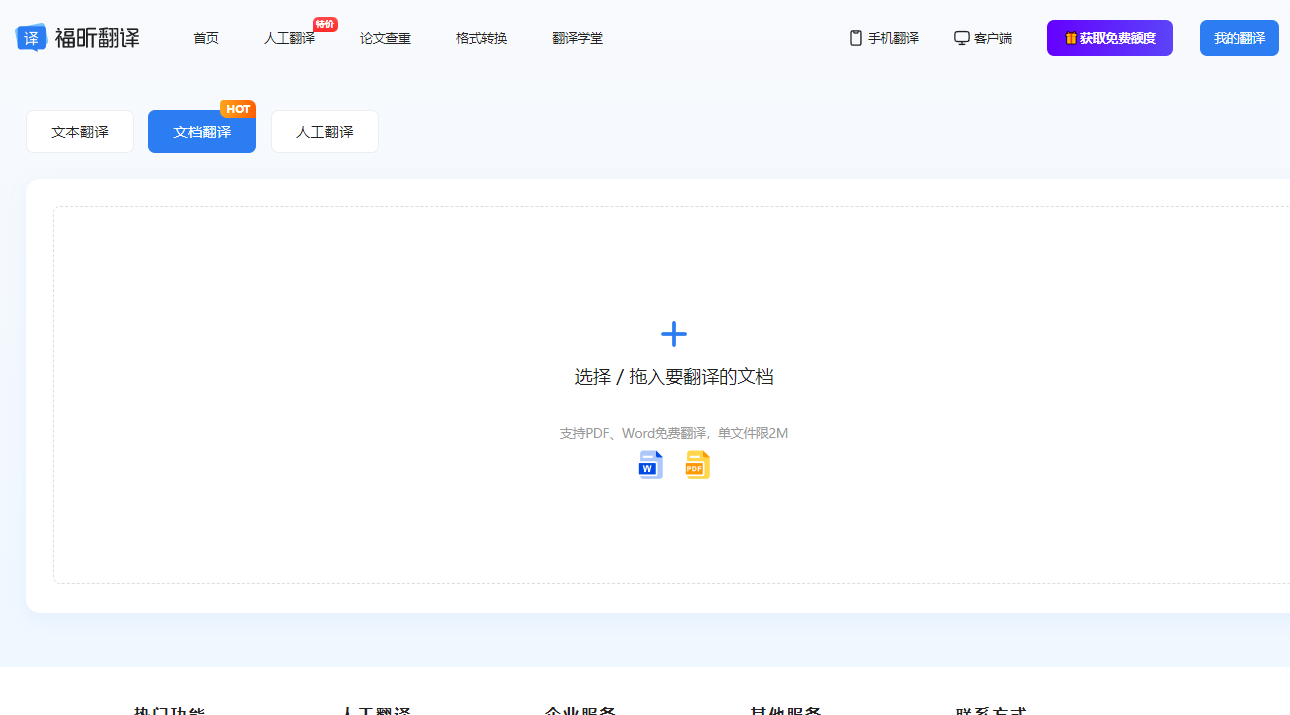 步驟二:點完【文字翻譯】之后,會出現(xiàn)下面這個頁面。然后咱們只需要上傳PDF文檔,翻譯就搞定了?
