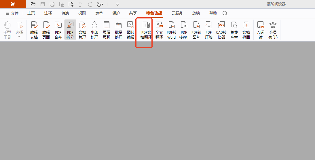 步驟一:打開安裝好的PDF閱讀器后,點擊上方菜單欄中的【特色功能】可以選擇里邊的【PDF文檔翻譯】和【全文翻譯】。這兩個方法都可以輕松將文件進行翻譯,一個是軟件版的,一個是網(wǎng)頁版的,需要的小伙伴可以嘗試一下,選擇一個適合自己的方法、
