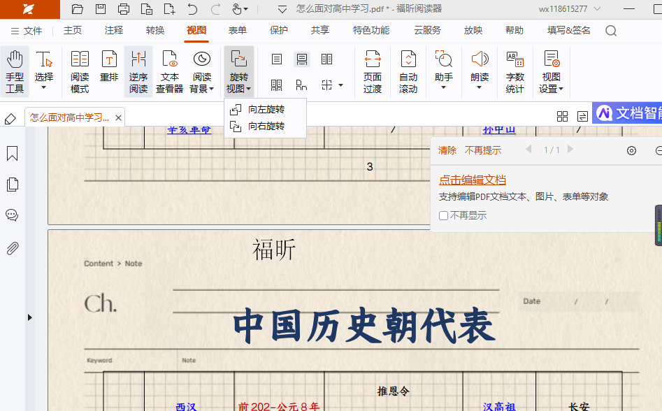 步驟二:打開文件后,點擊上方的【視圖】找到并選擇【旋轉(zhuǎn)視圖】可以選擇【向左旋轉(zhuǎn)】和【向右旋轉(zhuǎn)】大家根據(jù)自己的需求進行選擇。