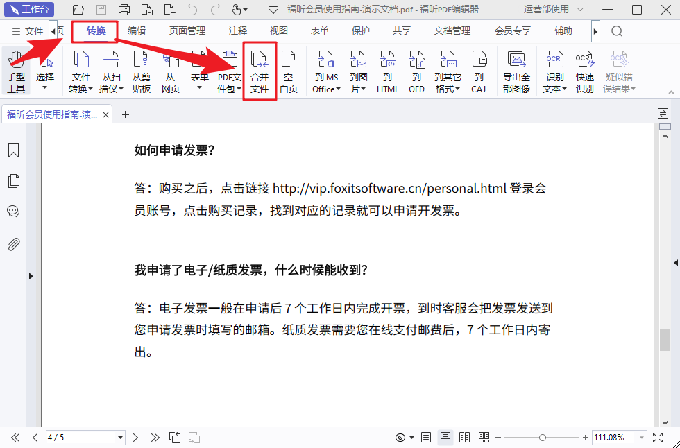 文檔打開后,咱們就得進(jìn)入合并環(huán)節(jié)了。在福昕PDF編輯器的工具欄中,找到并點(diǎn)擊【頁面管理】,然后選擇【合并】功能。