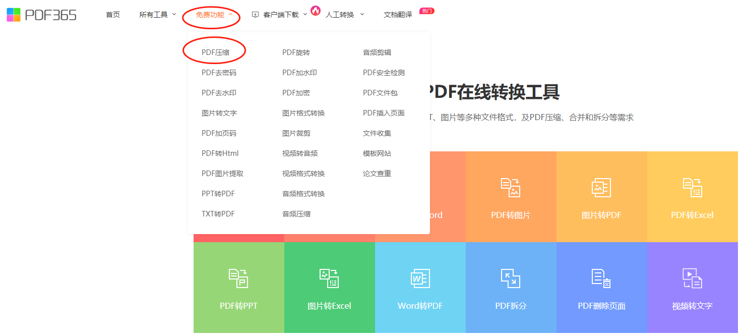 登錄網(wǎng)址:www.pdf365.cn后,可以看到五彩斑斕的工作界面。點(diǎn)擊頂部的“免費(fèi)功能”,再點(diǎn)擊“PDF壓縮”